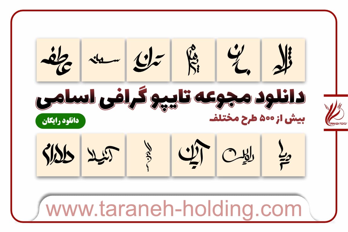 هلدینگ طراحی ترانه برای جلب رضایت کاربران خود اقدام به تهیه مجموعه ای متشکل از 500 تایپوگرافی اسامی فارسی مختلف نموده و آن را بصورت کاملا رایگان در اختیار شما قرار می دهد.